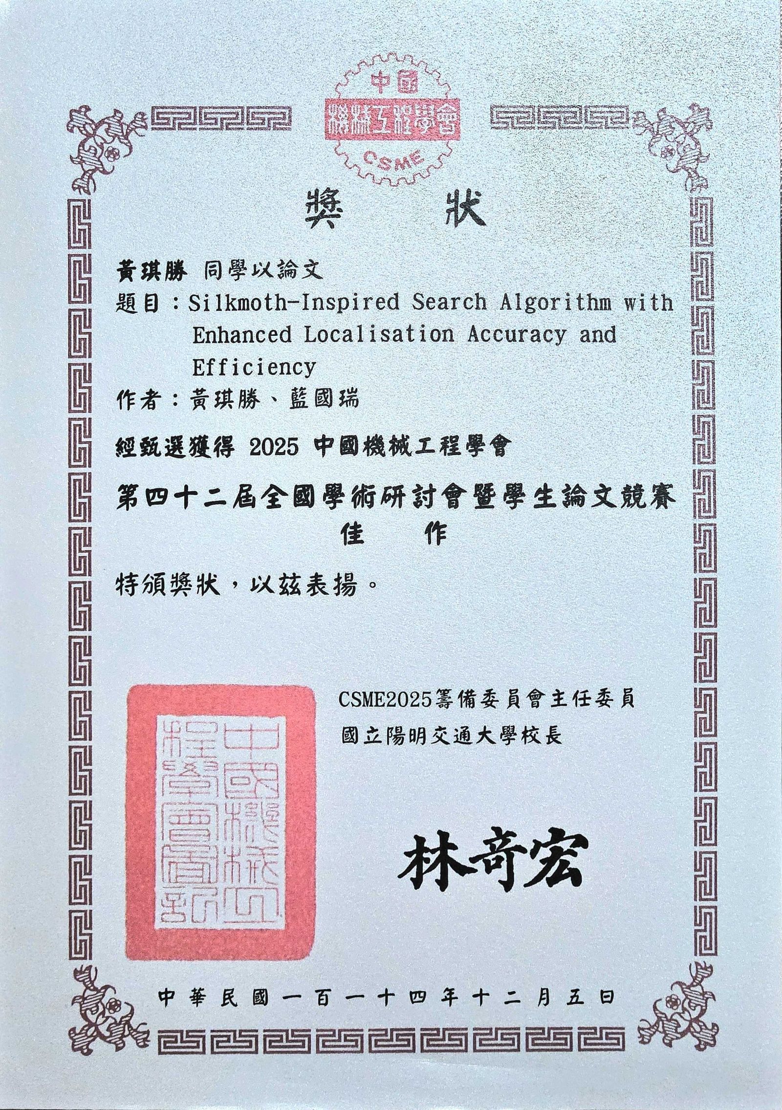 機械系研究生黃琪勝(指導教授:藍國瑞老師)參加「2025中國機械工程學會第四十二屆全國學術研討會暨學生論文競賽」,榮獲「佳作」。(114.12.05)