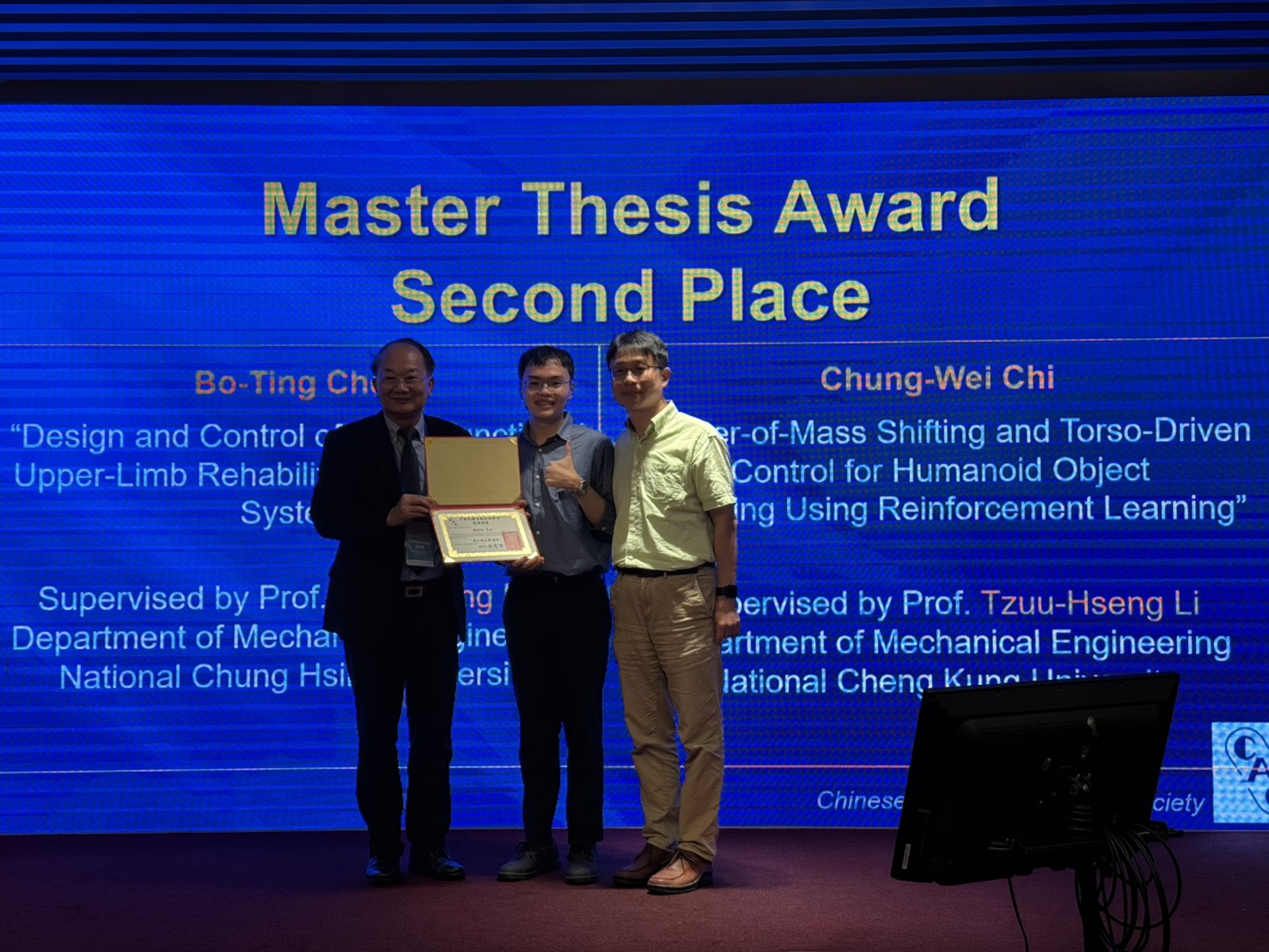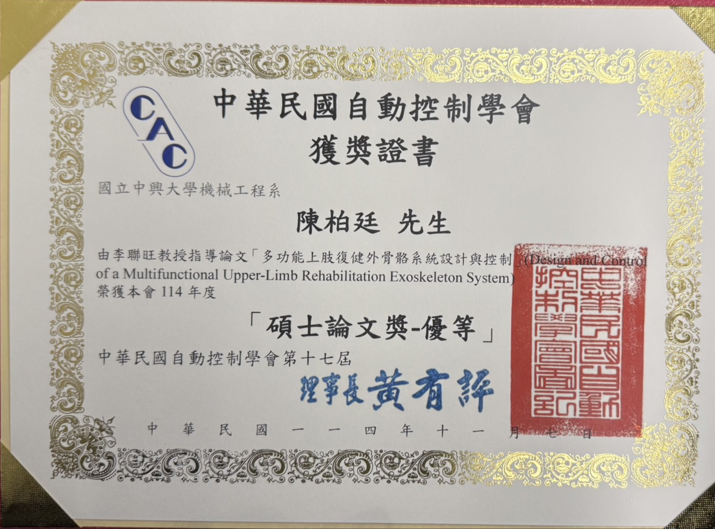 機械系研究生陳柏廷(指導教授:李聯旺老師)參加114年中華民國自動控制學會,榮獲碩士論文獎-「優等」(114.10.16)