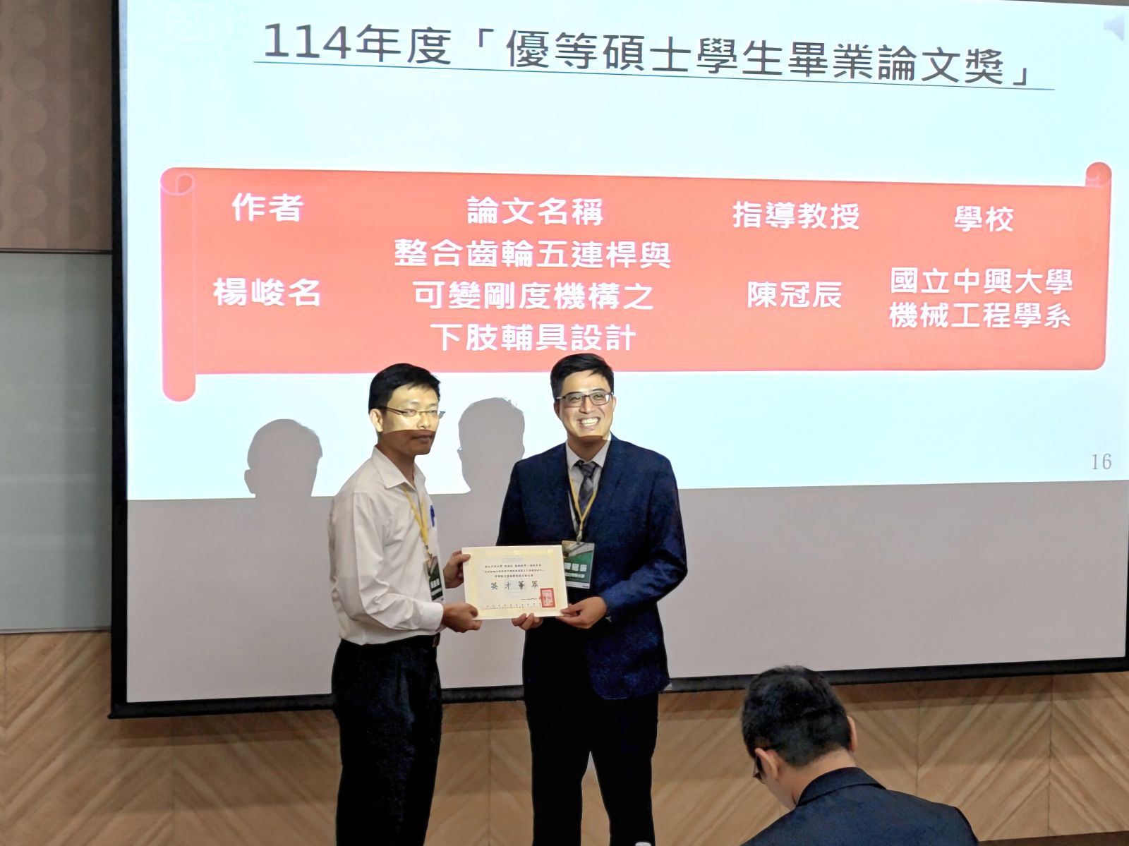 機械系研究生楊峻名(指導教授:陳冠辰老師)參加114年度中華民國機構與機器原理學會「學位論文獎」,榮獲優等碩士論文獎。