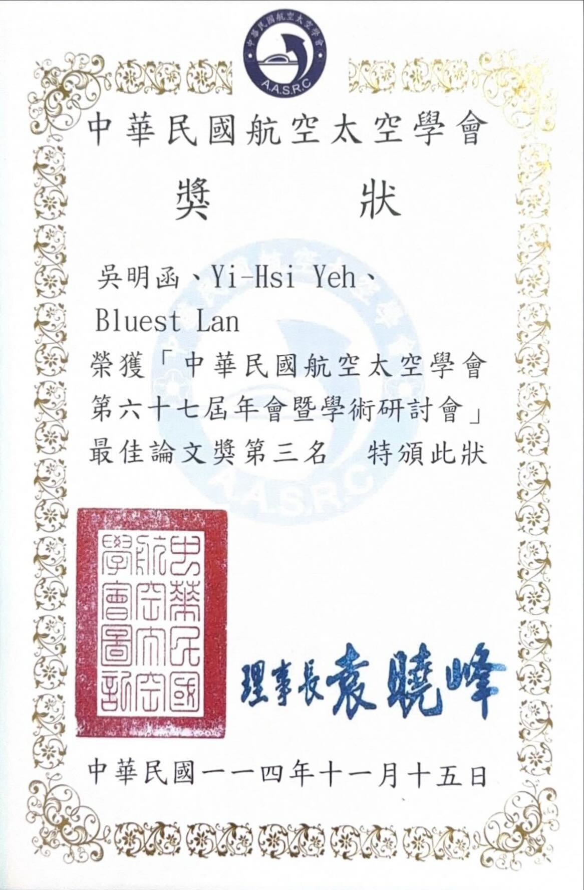 機械系研究生吳明函、葉奕希(指導教授: 藍國瑞老師)參加「中華民國航空太空學會第六十七屆年會暨學術研討會」,榮獲「最佳論文獎第三名」。(114.11.15)
